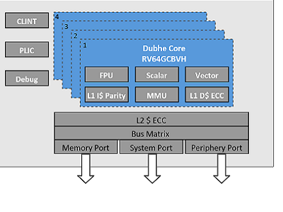 昉·天枢是全球已交付性能最高的64 位RISC-V CPU Core IP,采用12 级流水线、超标量、深度乱序执行等设计,支持标准RISC-V RV64GCBHN 扩展,同时还针对性能和频率做了深度的优化,SPECint2006 可达9.2/GHz。昉·天枢经过核芯复合体(Core Complex)预集成及验证,提供具备内存一致性的集群内单核、双核或四核的配置选择,简化了SoC 开发工作,可广泛用于数据中心、PC、移动设备、高性能网络通讯、机器学习等高性能计算场景、设备。