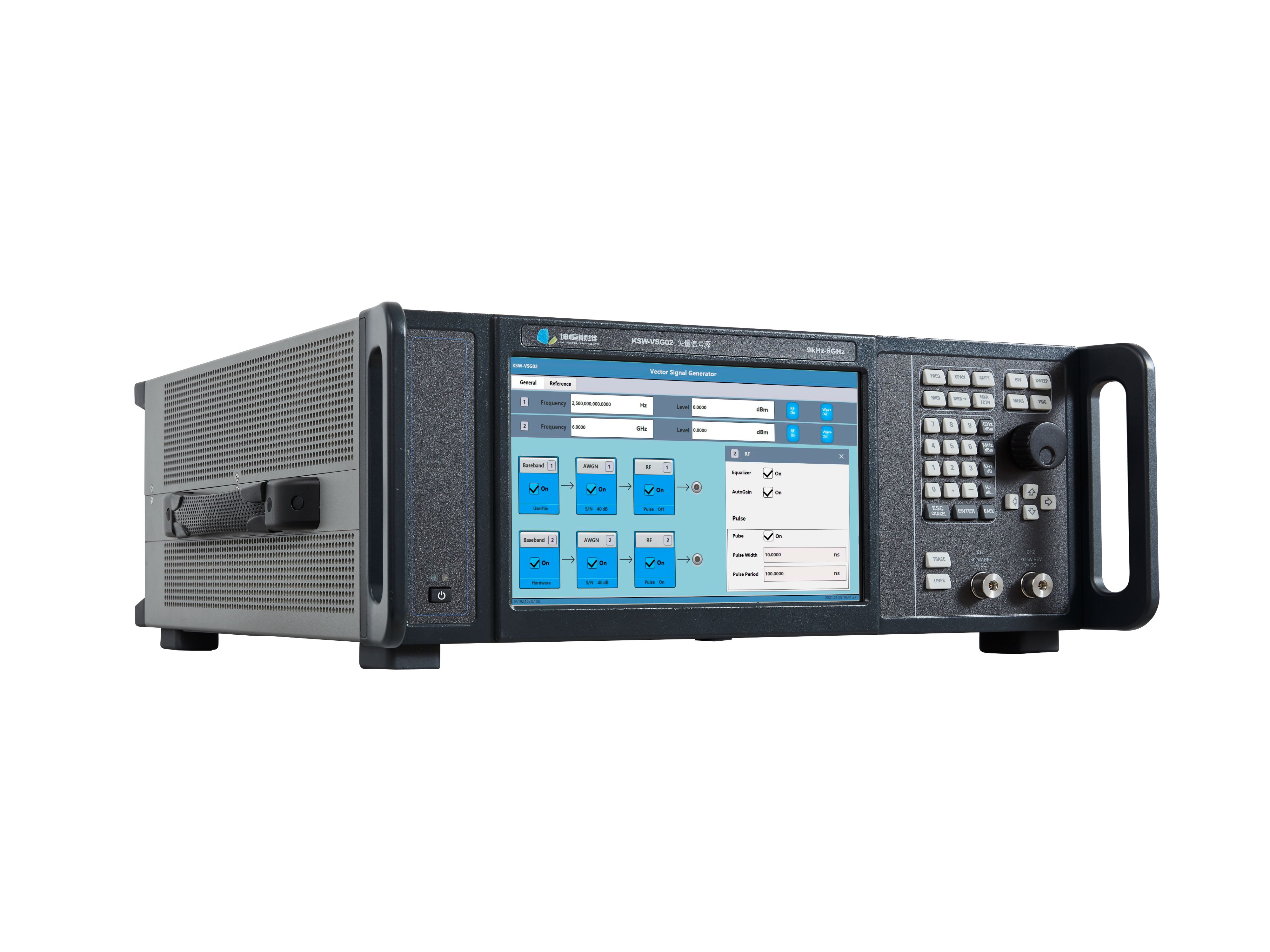 KSW-VSG02型覆盖100KHz ~ 44GHz 频率范围,具备优异的矢量调制性能,其内置基带信号发生器设置简单、性能灵活、调制样式多,还可以根据用户需要编辑、下载配置所需要的波形,进行各种负责信号模拟。具备最大2GHz射频带宽,可满足大带宽信号模拟需求。