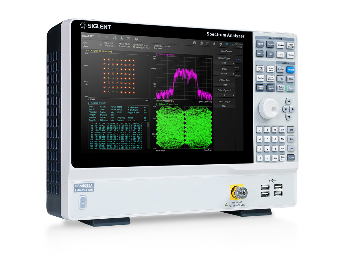 鼎阳SSA5000A频谱分析仪最高分析频率可达26.5 GHz,实时分析带宽 40 MHz,具有多种调制分析功能。