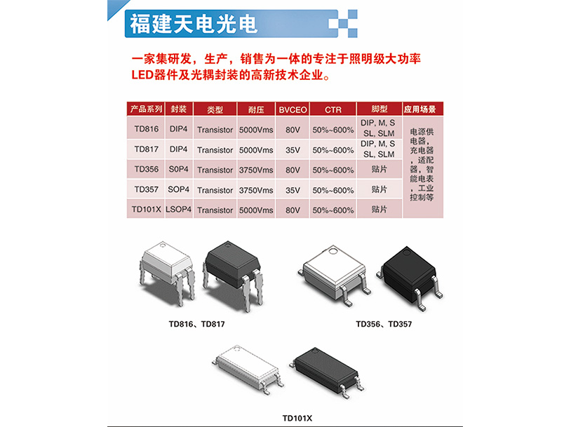 天电光电的光耦,封装DIP4 , SOP4 , LSOP4 , 脚型DIP, M ,SSL ,SLM, 贴片 ,应用场景 电源供电器,充电器,适配器,智能电表,工业控制等。