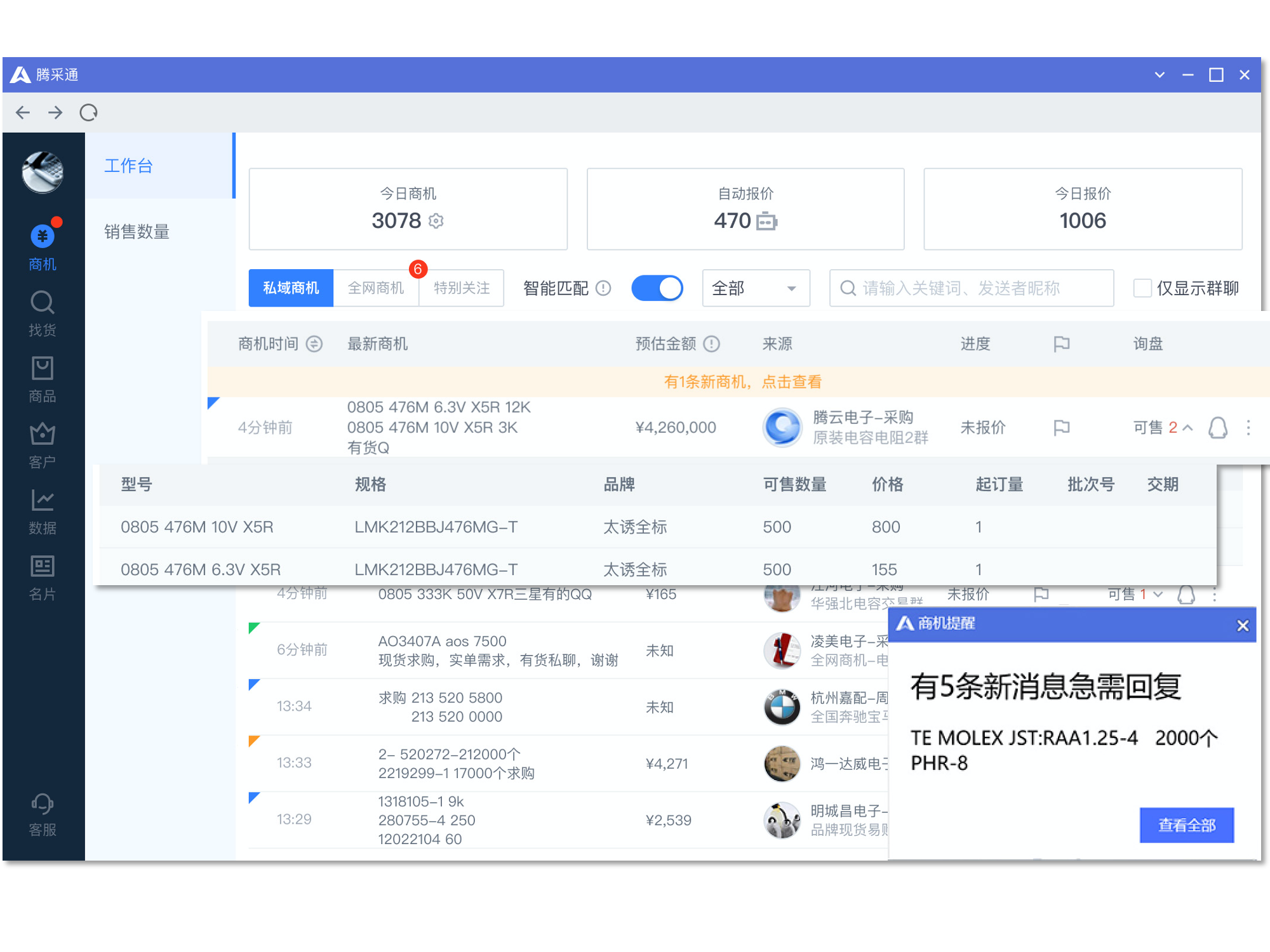 腾采通是由腾讯战略投资的B2B交易型SaaS产品,致力于为工业生意人提供便捷、高效的服务。通过将自然语言处理、深度学习能力首次运用到B2B询报价场景,帮卖家24小时自动抓取商机,精准匹配库存,自动报价!使产业链的交易效率和上下游供需匹配效率提升10倍以上,帮企业连接更多生意。还支持卖家将店铺开到QQ、微信里,主动触达更多潜客,买家可直接自主下单,客服机器人自动留存报价历史和交易记录,自动记录客户标签,形成私域客户池,高效复购转化,帮企业实现业绩持续增长。