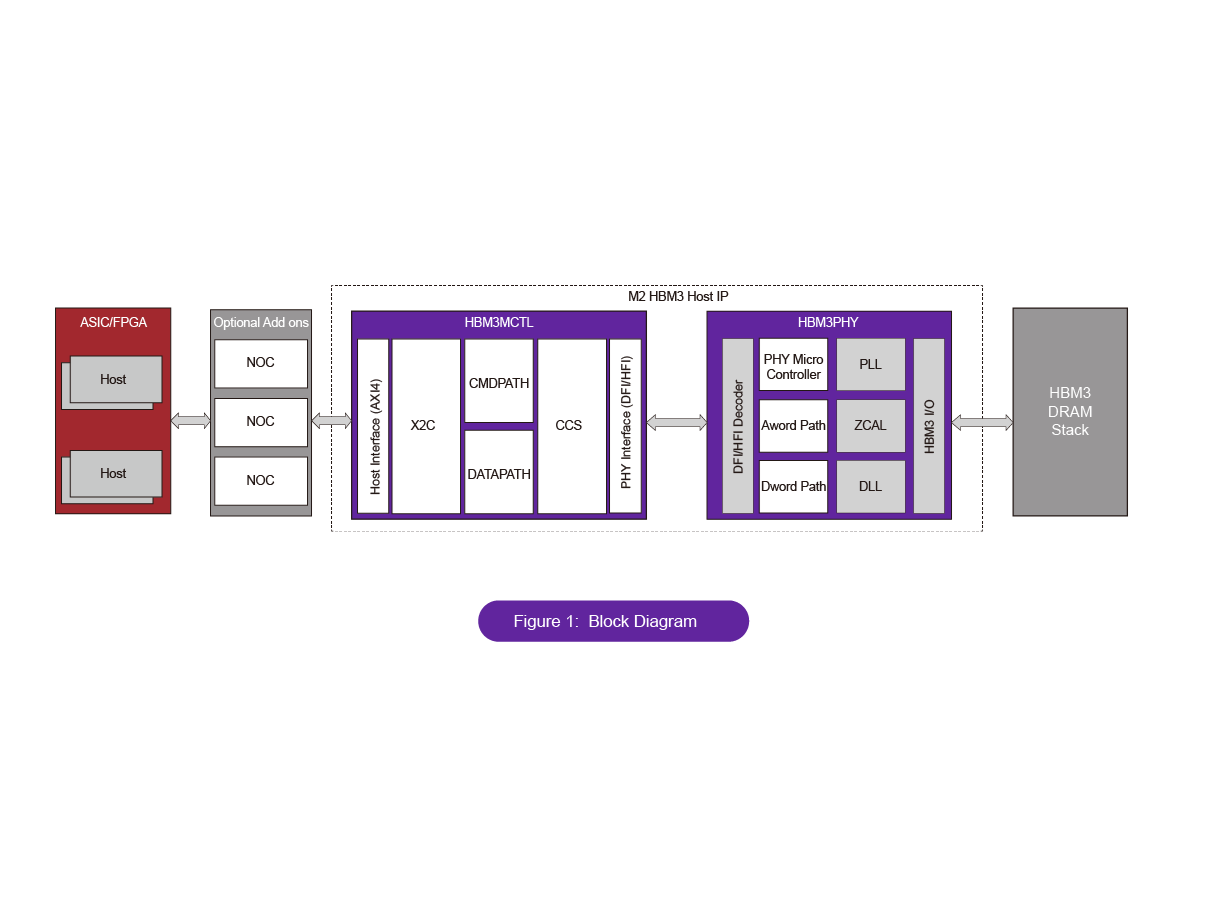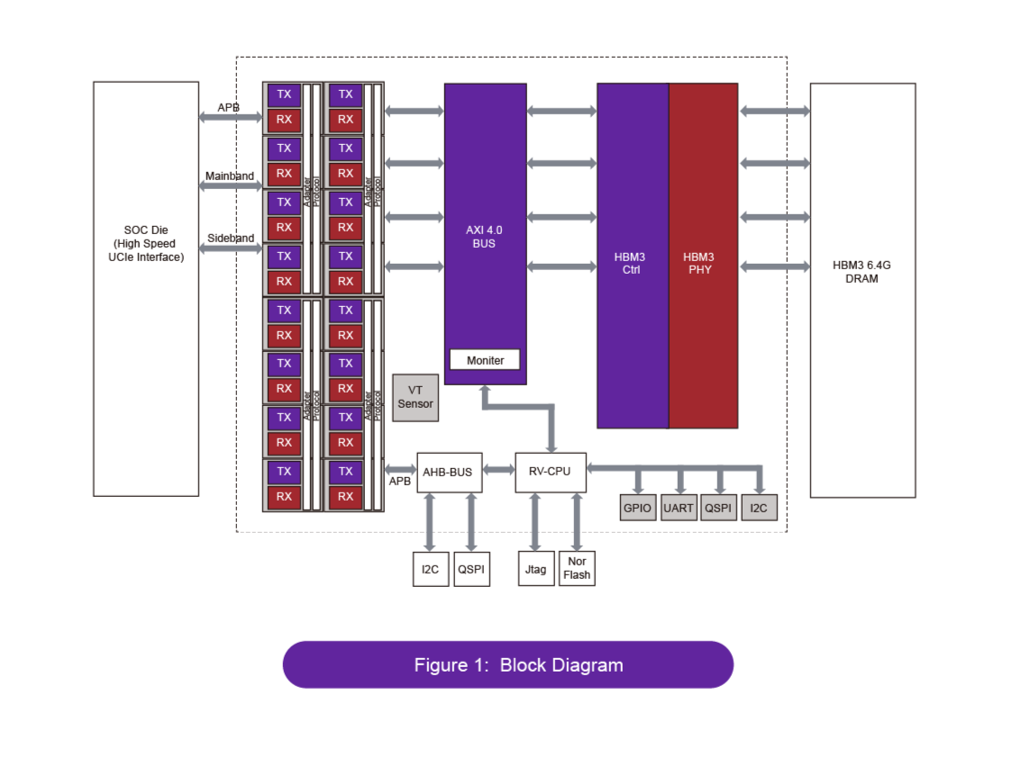 • Integrates one complete HBM3 IP, including the controller and PHY, following the HBM3 JESD238 standard