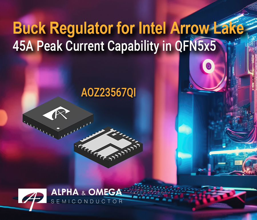 AOZ23567QI 是具有 45A 峰值电流能力的同步降压转换器,为Intel Arrow Lake CPU VCCPRIM_VNNAON 电源提供高度集成、紧凑和最高功率密度的解决方案